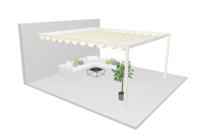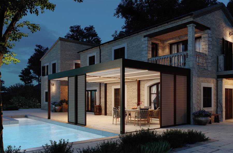 Die obere Schicht bietet einen wirksamen Schutz, während die untere Schicht einen ästhetischen Abschluss bildet. Beide Schichten können geöffnet werden, um unbegrenzten Raum zu genießen. Die einfache, kubische Form passt gut zum modernen architektonischen Stil, und die Möglichkeit der modularen Erweiterung entspricht den Bedürfnissen der HoReCa-Branche. Es eignet sich gut als Pavillon im Garten, als Erweiterung des Wohnzimmers oder als Überdachung in einem Betonband.