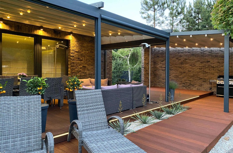 Elegancy ist ein klassisches Modell der Überdachung, das Schutz vor Sonne und Regen bietet. Das dreilagige Gewebe wirkt der Aufheizung der Terrasse entgegen und das schräge Dach leitet das Wasser effizient ab..