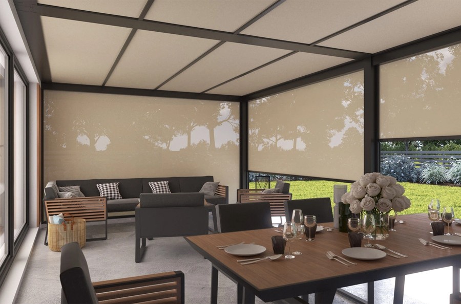 Optional ist es möglich, ein Unterdach zu bestellen – ein Stoff, der das Dach von unten abdeckt. Anschließend besteht die Unterseite des Daches aus ästhetischem Stoff und ist mit Balken ausgestattet, die die Installation von LED-Beleuchtung ermöglichen. Bei einem Dach aus Glas und Polycarbonat sorgt das Unterdach für die Beschattung des Raumes unter der Terrasse. Bei einem Dach aus Blech hingegen verbirgt das untere Gewebe das von unten sichtbare Blech, was dem Dach ein ästhetischeres Aussehen verleiht.