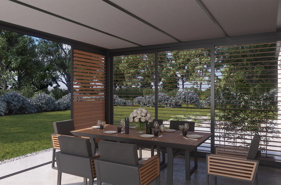 Es besteht aus Aluminiumprofilen (Beine und Rahmen) und Trapezblech (Dach) und ist ein perfekt gestaltetes Terrassendach, das Schutz vor Sonne, Regen und anderen Wetterbedingungen bietet und Ihnen gleichzeitig ermöglicht, die Schönheit der umliegenden Natur zu genießen.
