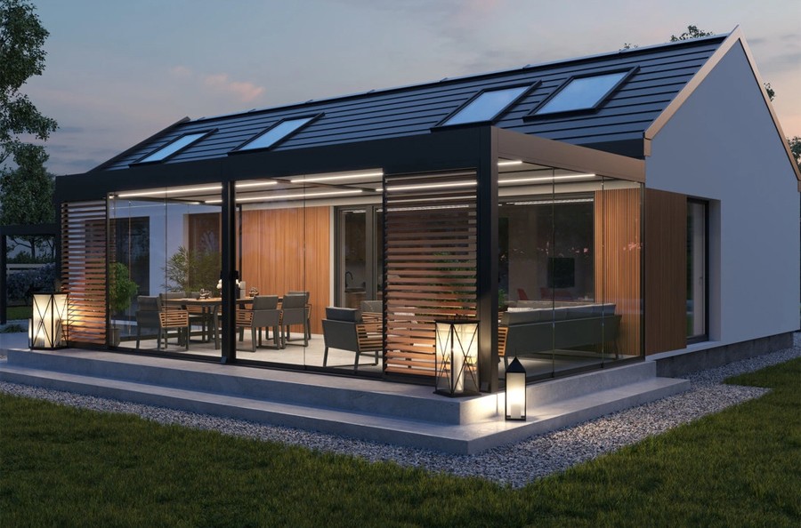 Der Strukturrahmen ist auch für den Einbau eines Glasdaches geeignet. Durch das transparente Dach wird der Raum heller, optisch vergrößert und erhält einen offeneren Charakter.