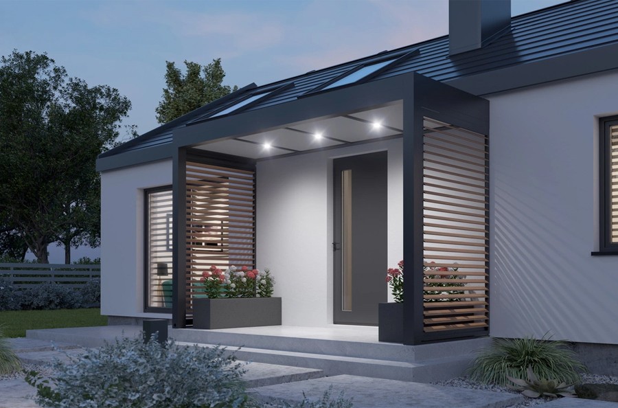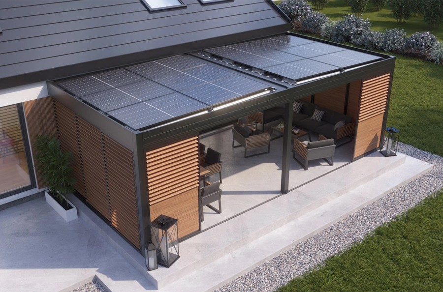 Eine dauerhafte Überdachung schützt nicht nur die Terrasse, sondern bietet auch eine tolle Möglichkeit, Photovoltaik-Module auf dem Dach zu installieren und den erzeugten Strom für den Betrieb von Haushaltsgeräten zu nutzen. Das Set mit Photovoltaikmodulen umfasst ein Ladegerät mit einer Leistung von bis zu 22 kW, 32 A, dreiphasig und der Funktion Demand Limitation Pro, die das Laden mit der maximal verfügbaren Leistung ermöglicht, ohne diese zu überschreiten.